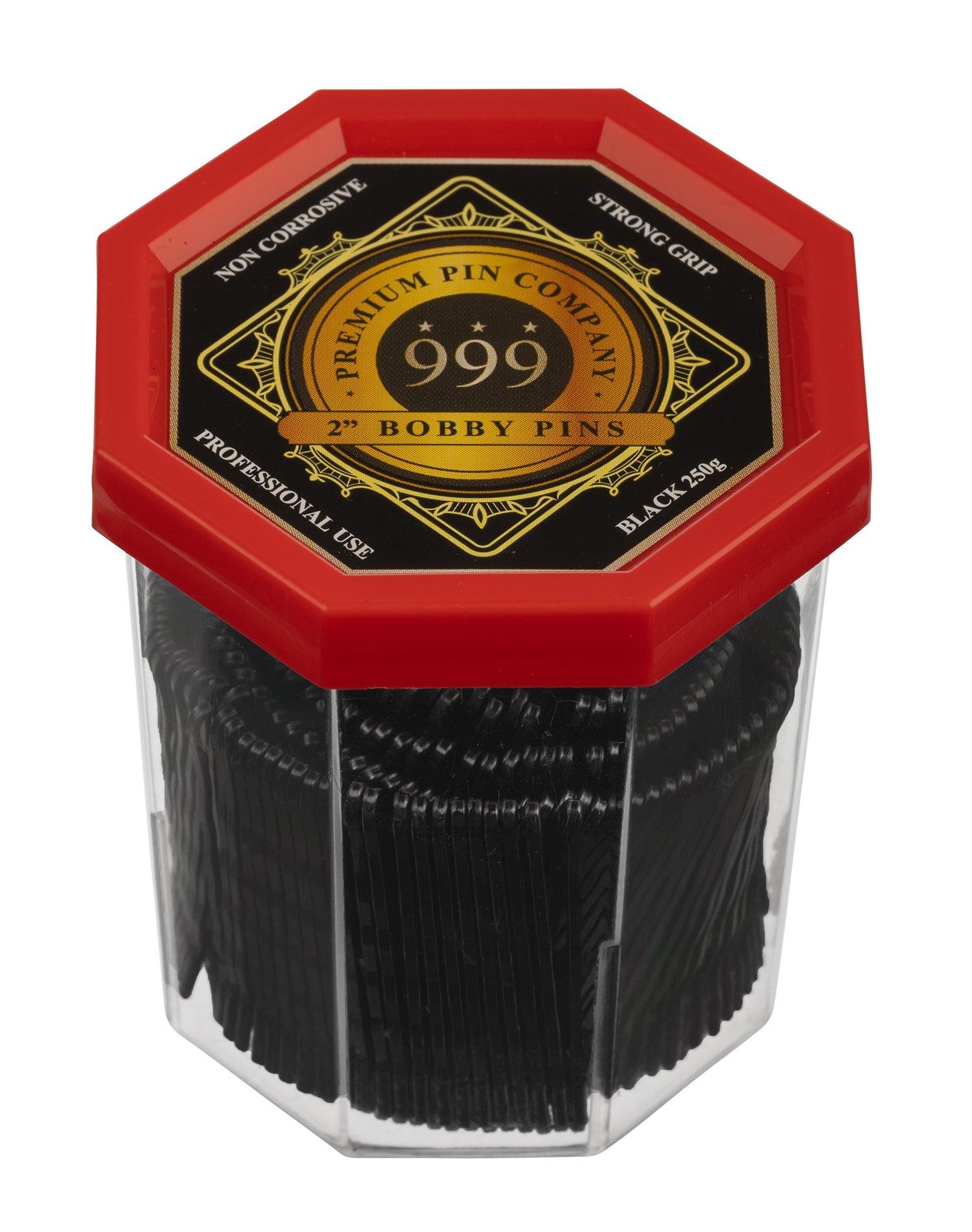 Premium Pin Company 999 Bobby Pins 2” Black 250g are expertly designed to meet the demands of hairdressing professionals and enthusiasts alike. With an extra-strength design, they securely hold your hairstyle or updo in place, ensuring a flawless look that lasts. The long-lasting spring, firm secure grip, durable tips, and rust-resistant materials make these bobby pins a reliable choice for your hairstyling needs. Convenience is key, which is why our bobby pins are housed in an easy-to-use see-through dispenser. No more fumbling through drawers struggling to find the right pin. Our dispenser keeps your pins organised and within reach, making hairstyling effortless. Choose Premium Pin Company 999 for superior quality and performance.