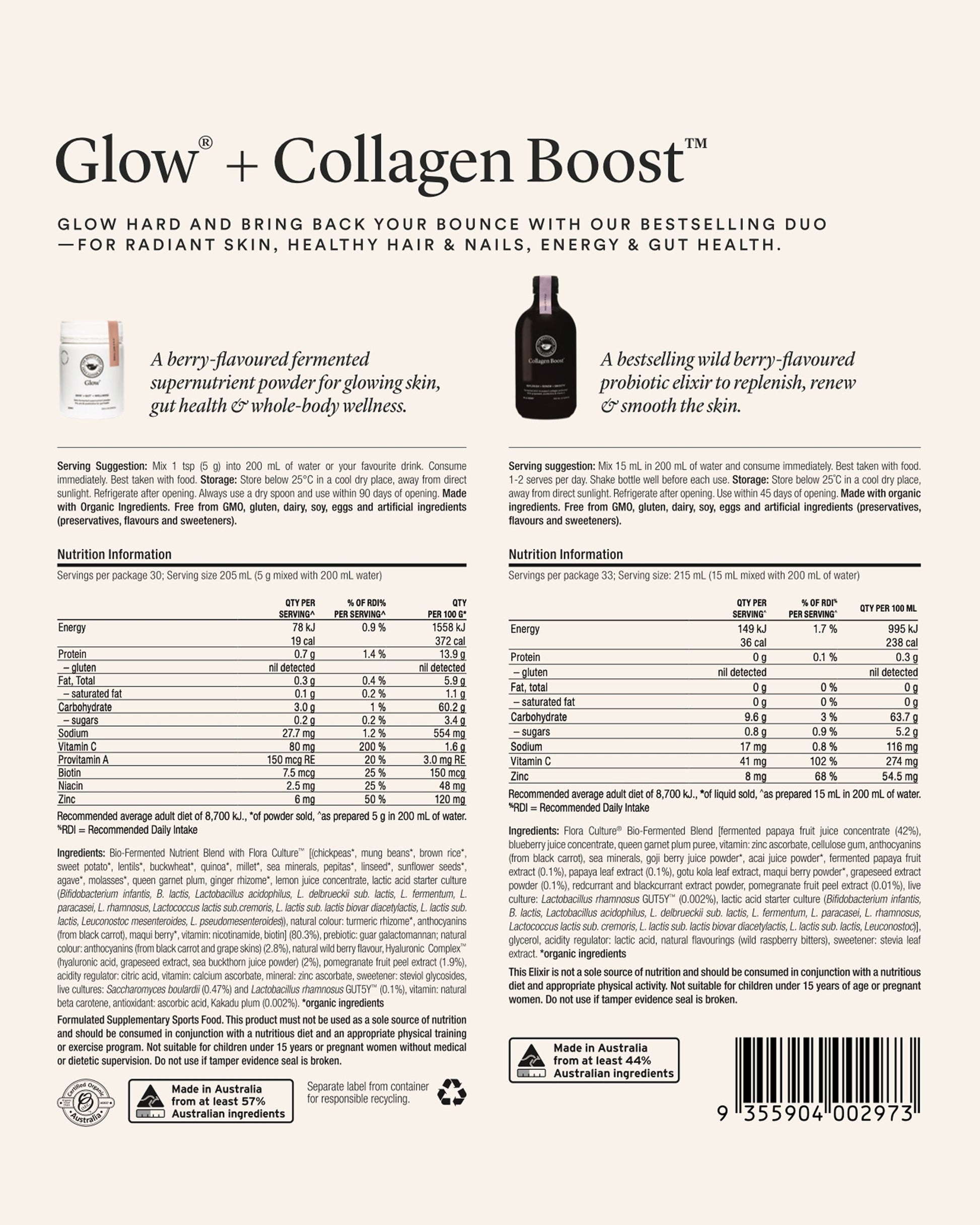 Made with pre-, pro-, and postbiotics, plus 16 Certified Organic wholefoods including maqui berries, queen garnet plum, and pomegranate peel extract. Enhanced with Hyaluronic Complex™, a powerful blend of sea buckthorn, grapeseed extract, and hyaluronic acid for your healthiest, glowiest results yet.
