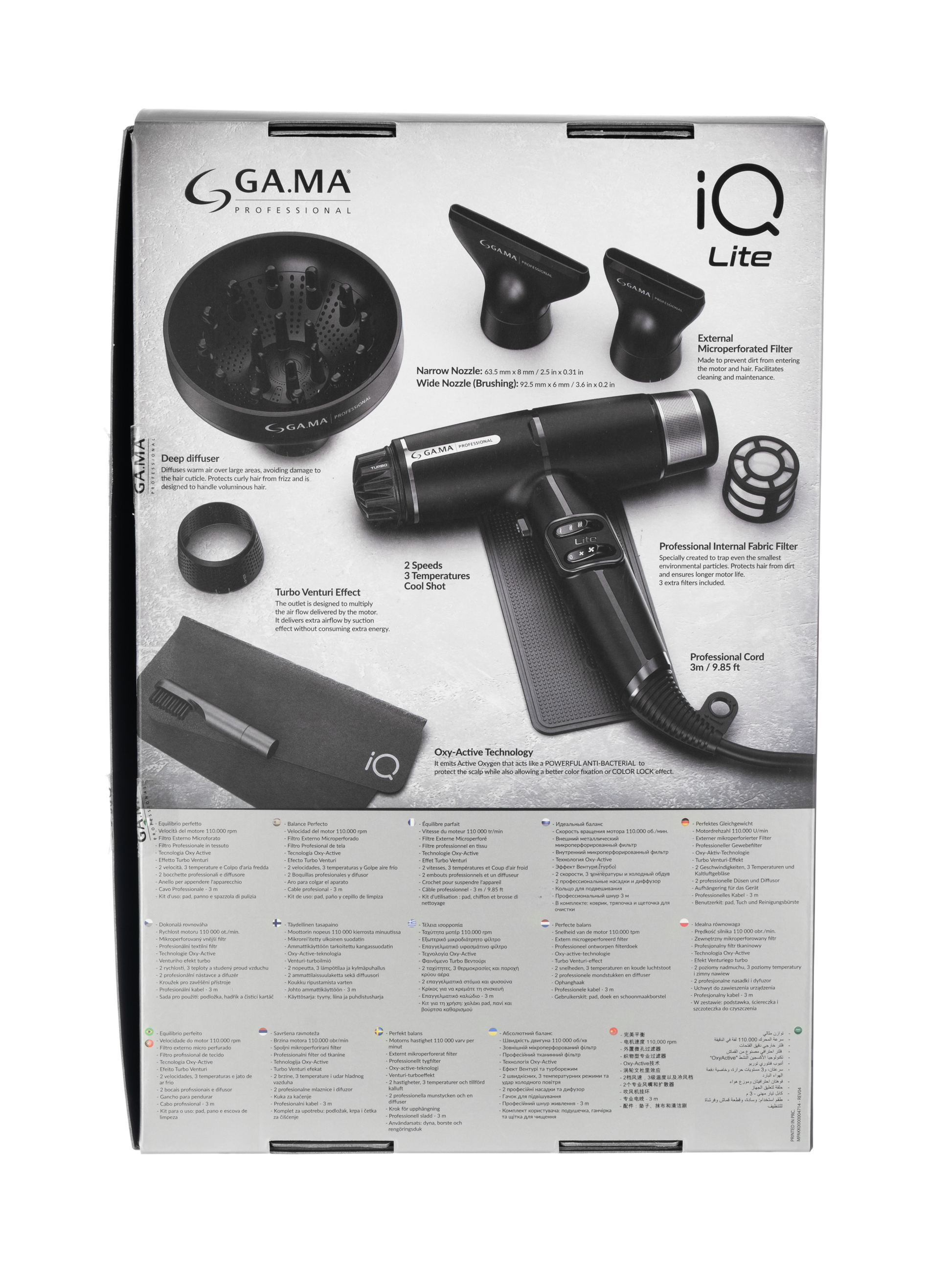 Italian elegance and technological innovation meld flawlessly in iQ Lite Perfetto Hair Dryer Black by GAMA Italy. This ultra-compact hair dryer is designed to deliver impeccable results with maximum comfort. The perfect hair dryer for home, you will experience cutting edge functionality with an incredibly light weight of only 316 grams. Next generation brushless motor with a powerful 110,000 rpm. Venturi Effect amplifies airflow without increasing energy consumption, dramatically reducing drying time. Oxy Active Technology with negative ions for silky, frizz-free and hydrated locks. 3 temperature / 2 speed settings plus a cold shot button