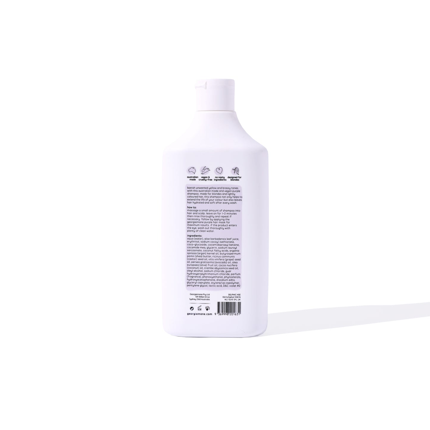 1) Massage the purple shampoo into hair and scalp 2) Leave on for 1-2 minutes then rinse thoroughly until water runs clear and repeat if necessary Pair with the georgiemane purple hair mask for maximum repair & toning results