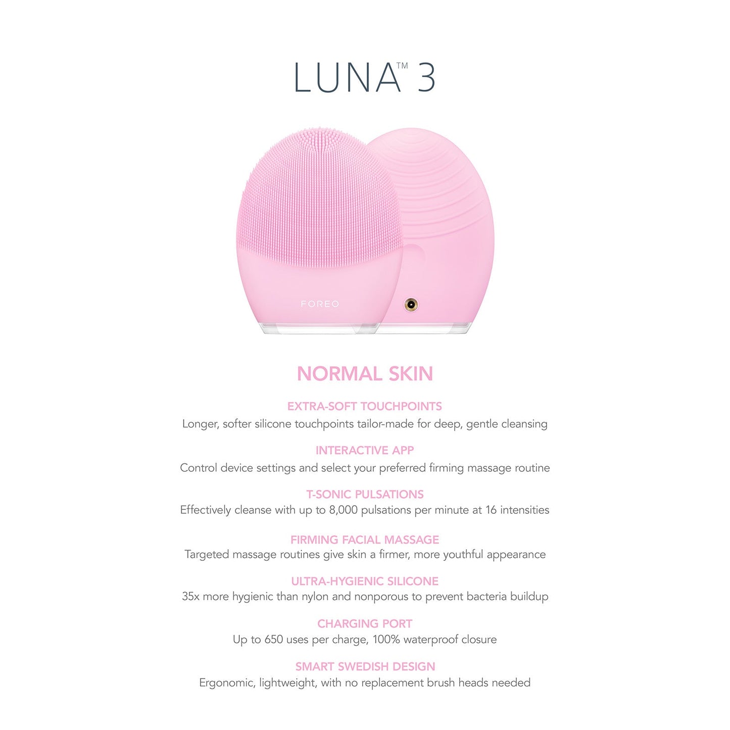 2-in-1 cleansing and firming. Powered by T-Sonic‚Ñ¢ pulsations. Perfectly tailored to your skin. The iconic LUNA‚Ñ¢ 3 is made of velvety soft silicone that is bacteria-resistant, and 35x more hygienic than nylon brushes. Flip it over to transform it into a firming massage device, that pushes active ingredients from your skincare deep into your skin - where they work best.
