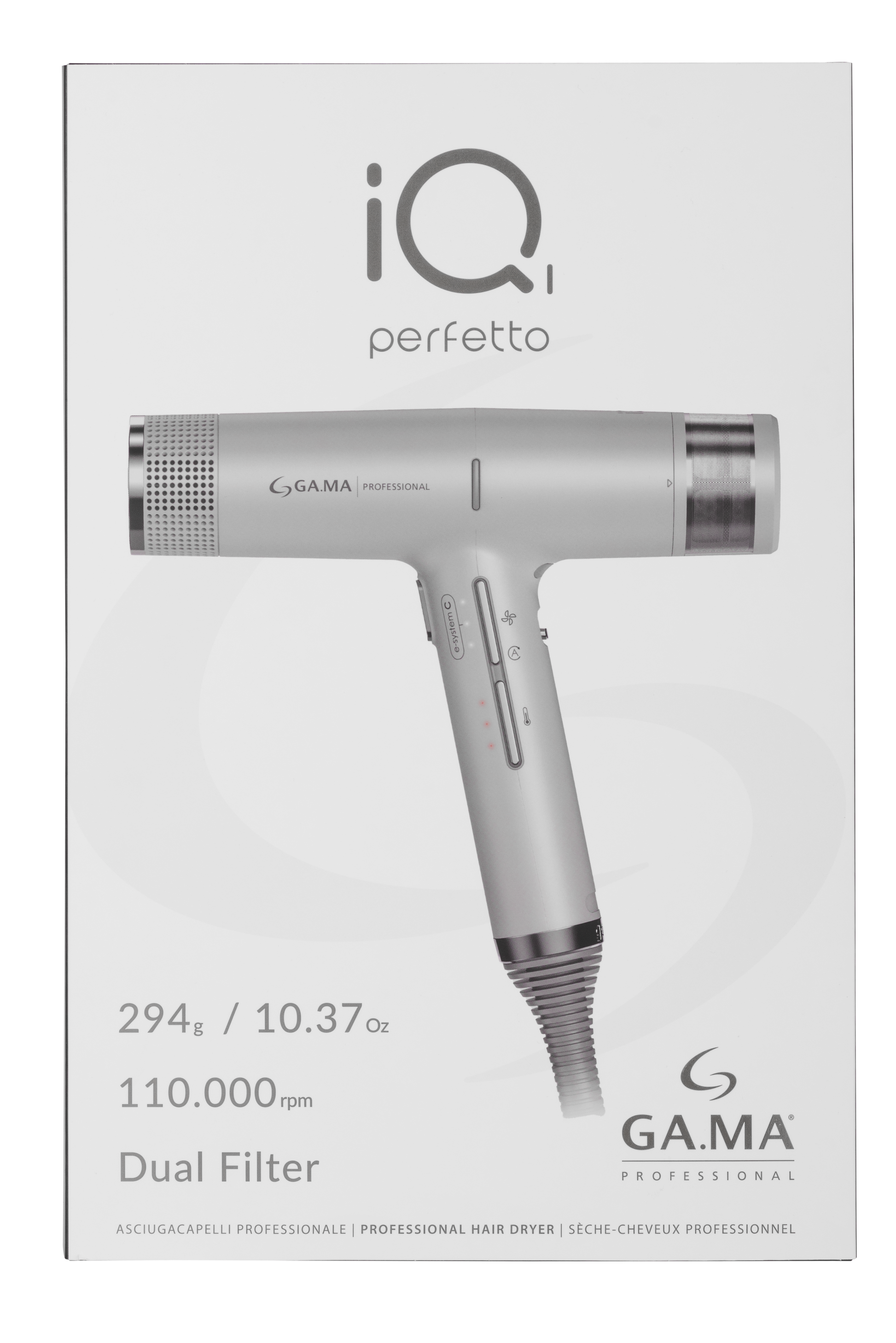 Lightweight, powerful and intelligent. Dry hair faster than ever before. Now with advanced improvements, iQ1 Perfetto Hair Dryer Silver by Gamma Professional is the perfect mix of extremely compact and powerful. 294 grams of incredible innovation with an intelligent brushless, long-life motor capable of speed to 110,000 rpm (seven times faster than a traditional hair dryer). 1600 watts of undeniable power. Futuristic, sleek design. Now with added cleaning brush, heat pad and metallic, microperforated snap lock mesh filter.