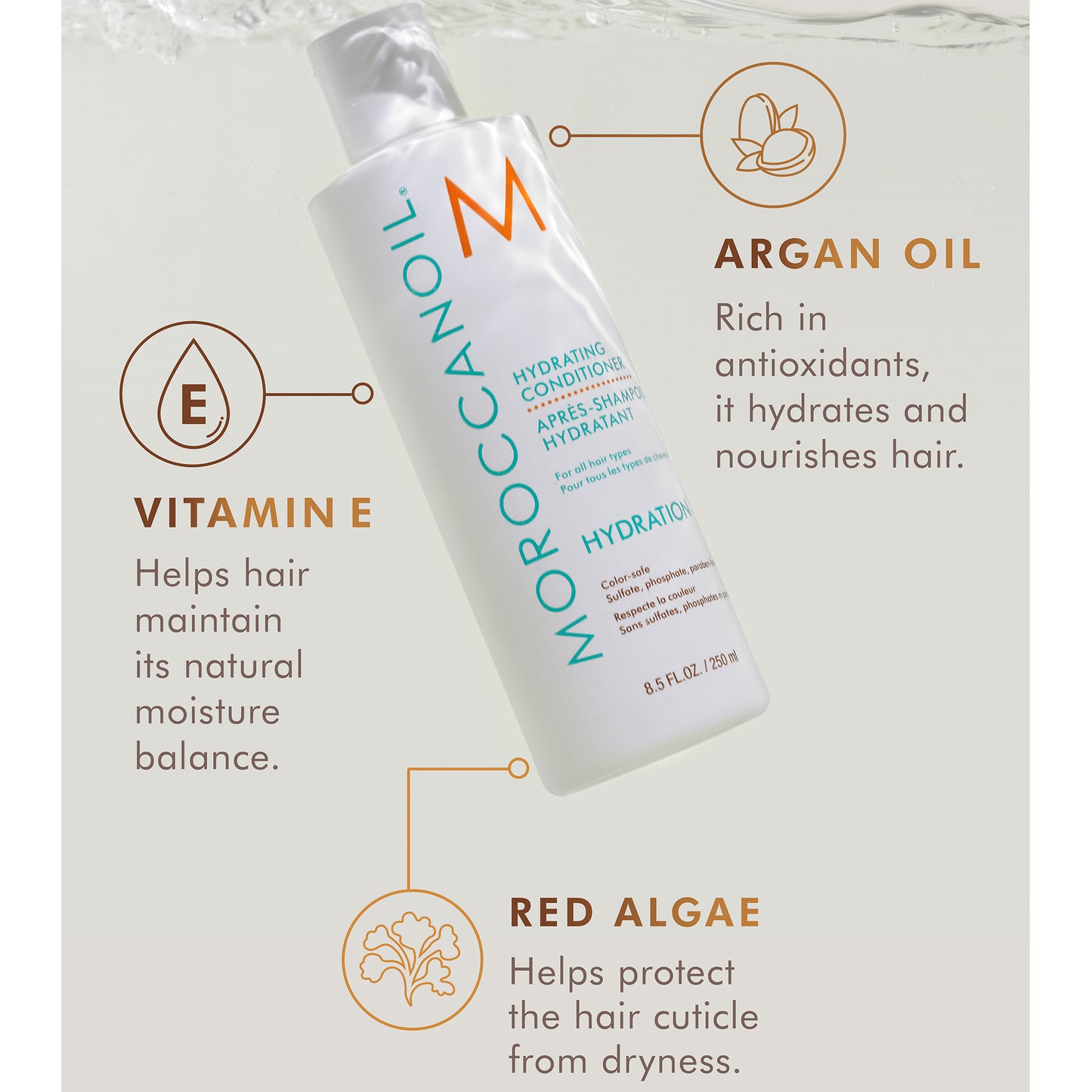 Moroccanoil Hydrating Conditioner is a moisture-balancing product designed to nourish and gently detangle hair. It is infused with argan oil, red algae, and vitamins A and E. This gentle, daily-use formula effectively conditions and detangles dehydrated hair, leaving it smoother, more manageable, and easier to style. Suitable for all hair types—from normal to dry—the conditioner is also color-safe, providing optimal hydration and care.